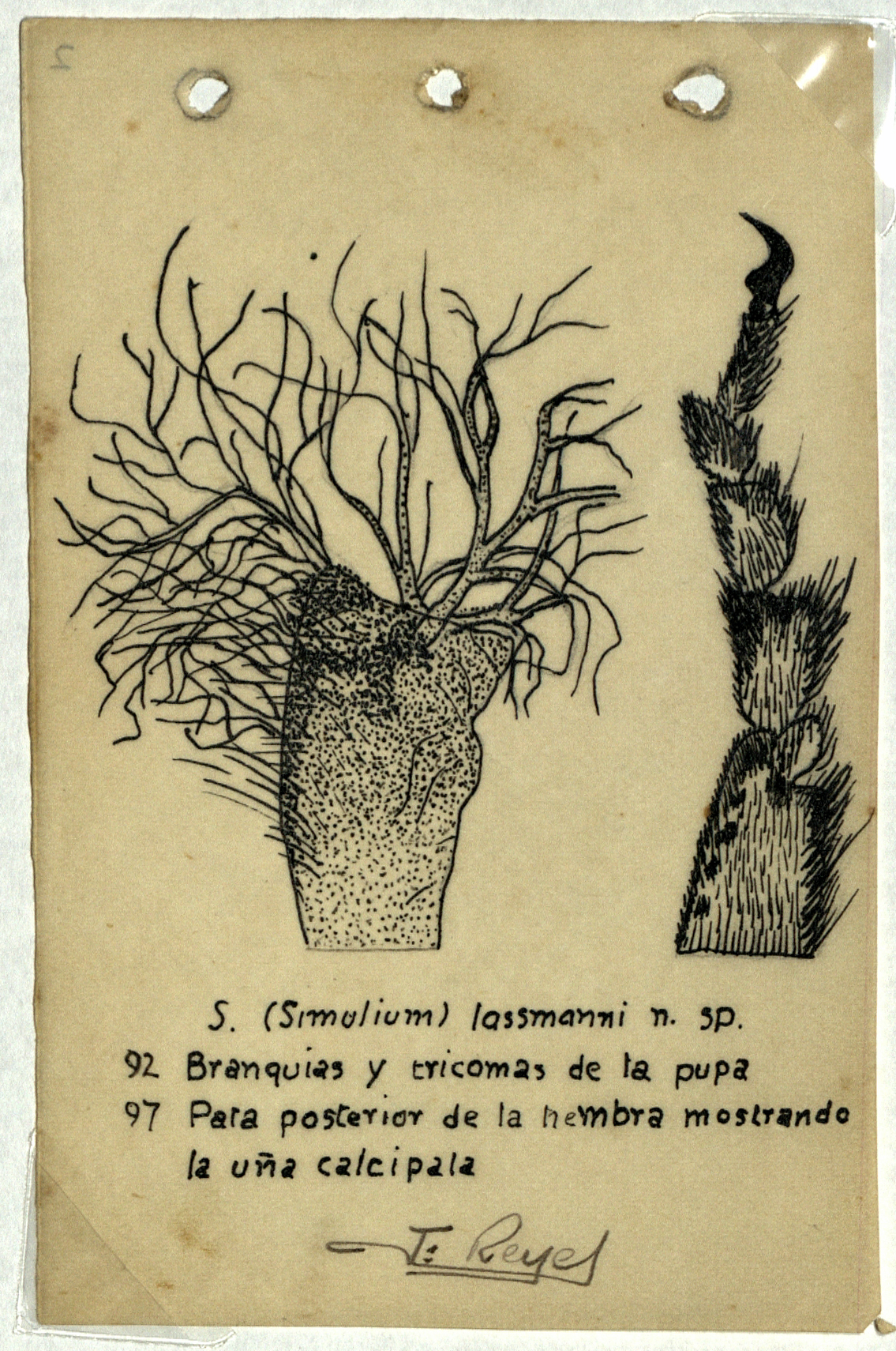 Dibujo de S. (Simulium lassmanni n. sp. las branquias y tricomas de la pupa y pata posterior de la hembra mostrando la uña calcipala. Campaña contra la oncocercosis y mal de pinto en la Sierra Norte del Estado de Oaxaca.