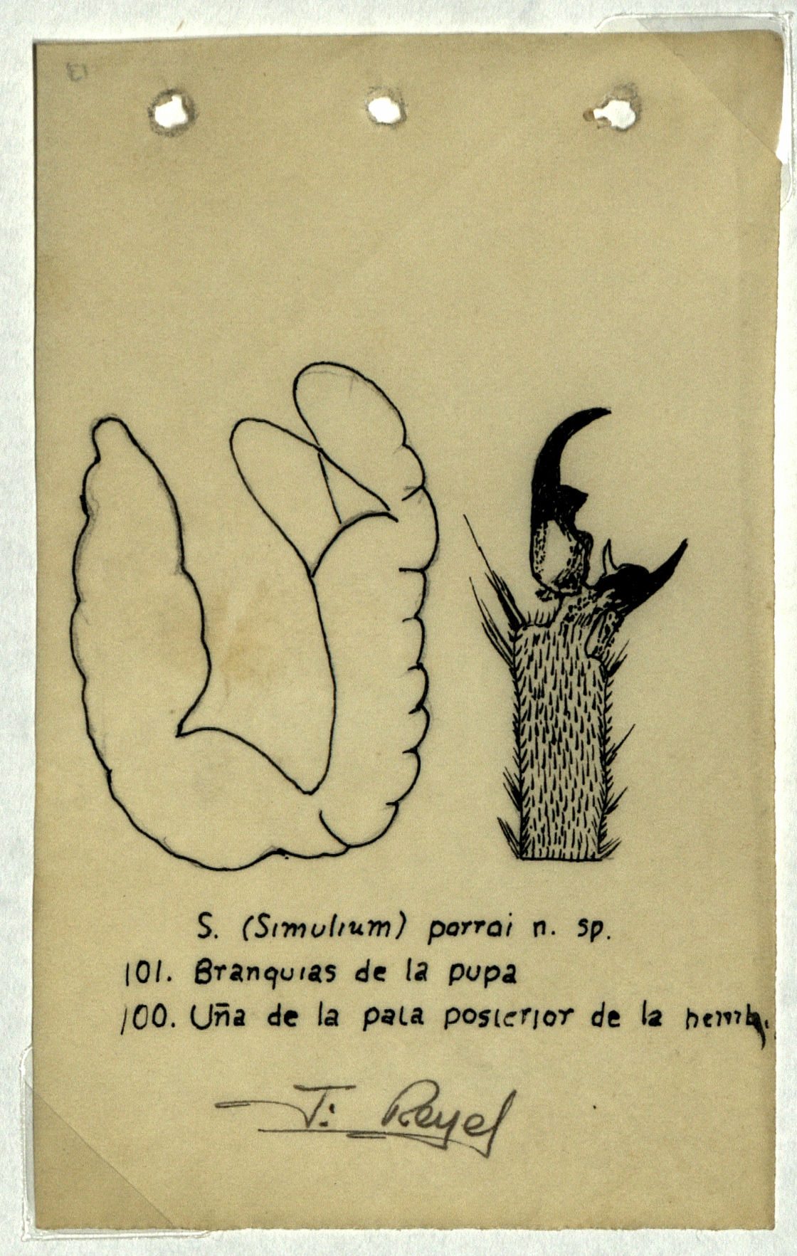 Dibujo de S. (Simulium) parrai n. sp., branquias de la pupa y uña de la pata posterior de la hembra. Campaña contra la oncocercosis y mal de pinto en la Sierra Norte del Estado de Oaxaca.