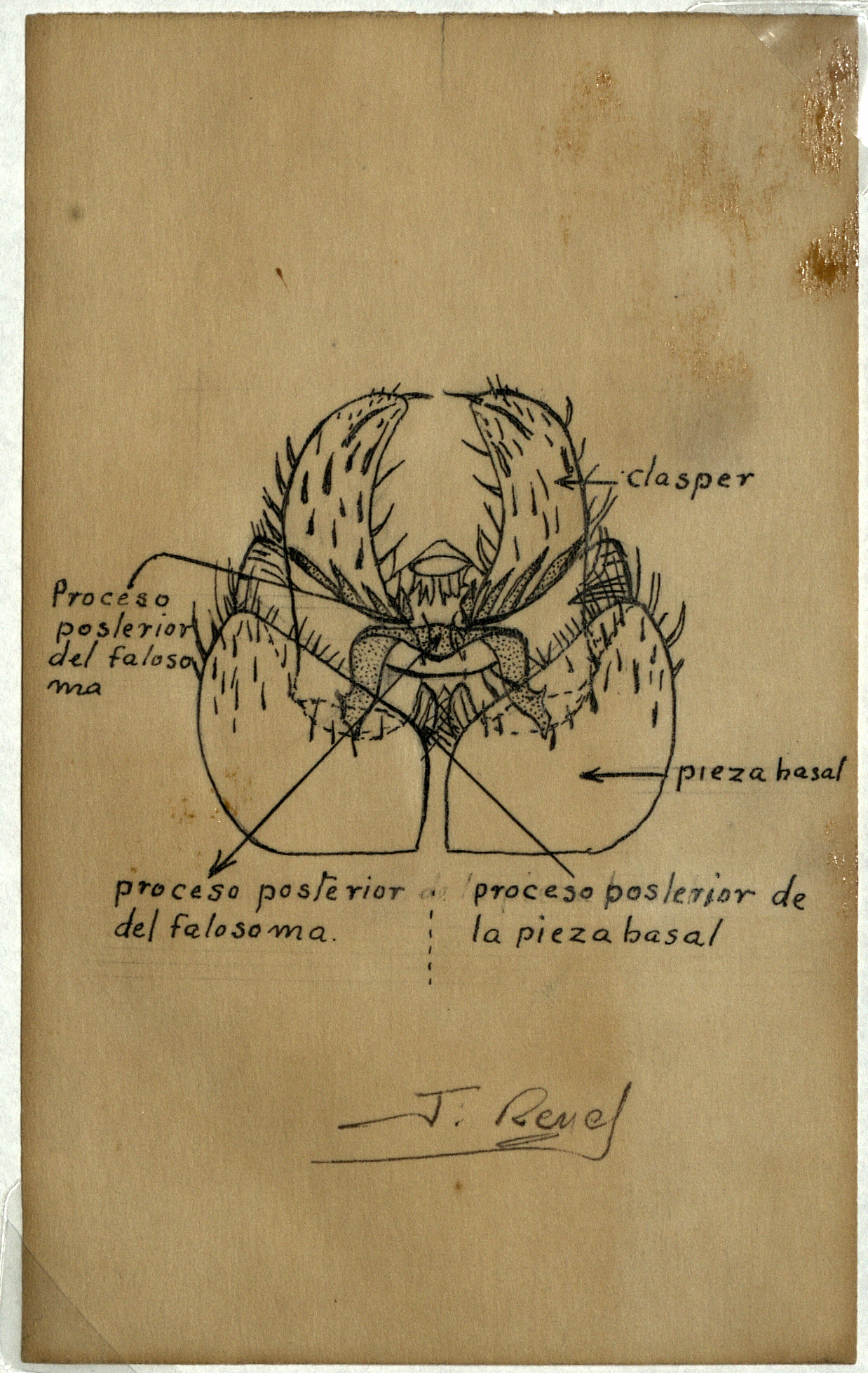 Dibujo de la cabeza de simúlido desconocido, describe: clasper, pieza basal, proceso posterior del falosama, proceso posterior de la pieza basal, contiene la firma del autor. Compaña contra la oncocercosis y mal del pinto en la Sierra Norte de Oaxaca.
