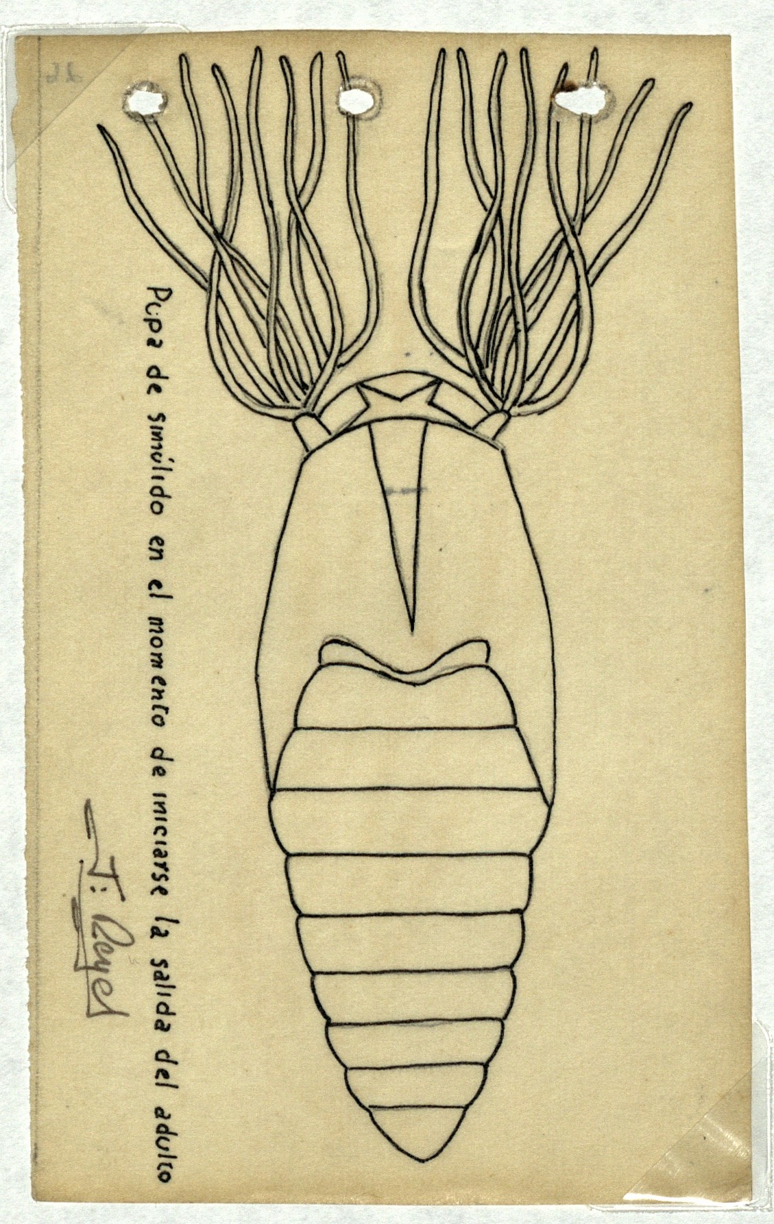 Dibujo de la pupa de simúlido en el momento de iniciarse la salida del adulto. Campaña contra la oncocercosis y mal de pinto en la Sierra Norte del Estado de Oaxaca.