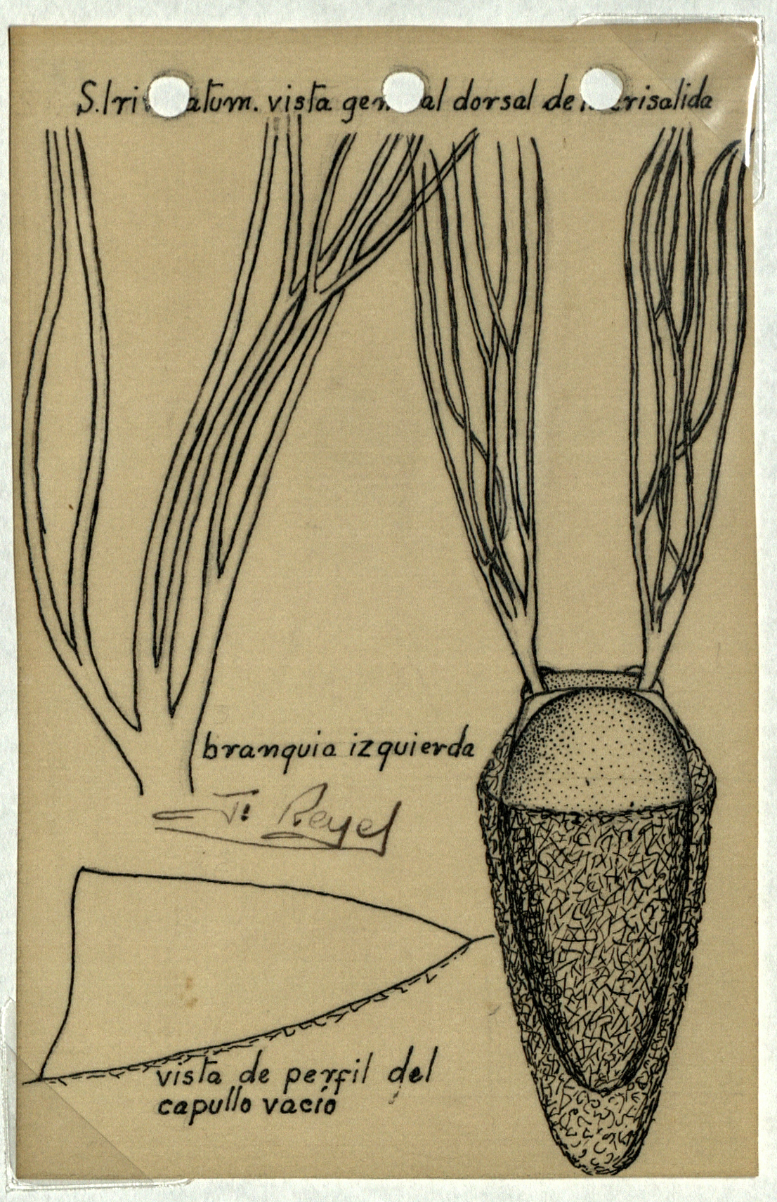Dibujo de S. Trivittatum. Vista general dorsal de la crisalida. Branquia izquierda y vista de perfil del capullo vacío. Campaña contra la oncocercosis y mal de pinto en la Sierra Norte del Estado de Oaxaca.