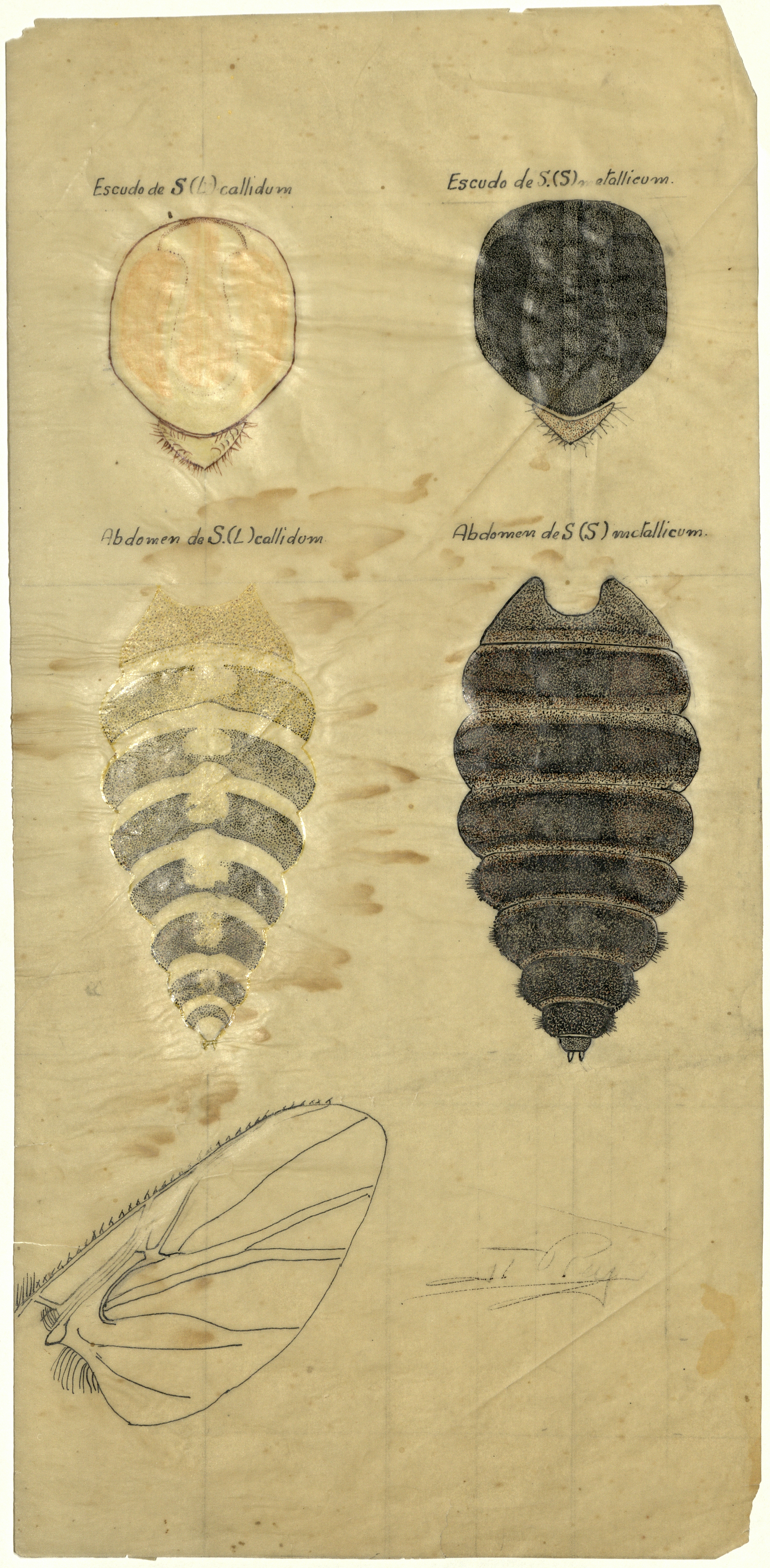 Dibujos de escudo y abdomen simulido callidum, escudo y abdomen de simúlido metallicum, ala de simúlido sin identificar, deformaciones y faltante en el ángulo superior derecho, contiene la firma del autor. Compaña contra la oncocercosis y mal del pinto en la Sierra Norte de Oaxaca.