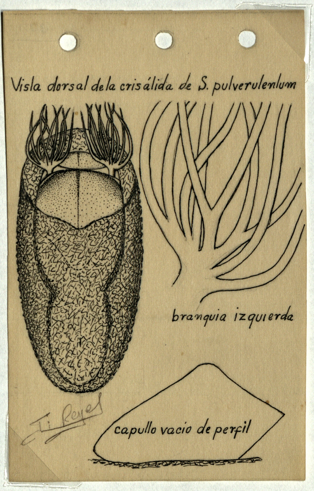 Dibujo de vista dorsal de la crisálida de S. pulverulenlum. branquia izquierda y capullo vacio de perfil. Campaña contra la oncocercosis y mal de pinto en la Sierra Norte del Estado de Oaxaca.