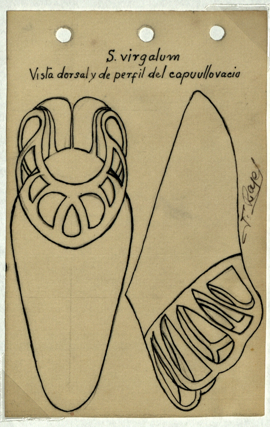 S. virgalum. Vista dorsal y de perfil de capullo vacío.