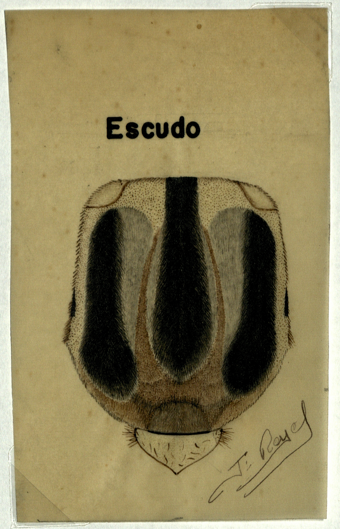 Dibujo de escudo de simúlido desconocido, contiene firma del autor. Compaña contra la oncocercosis y mal del pinto en la Sierra Norte de Oaxaca.