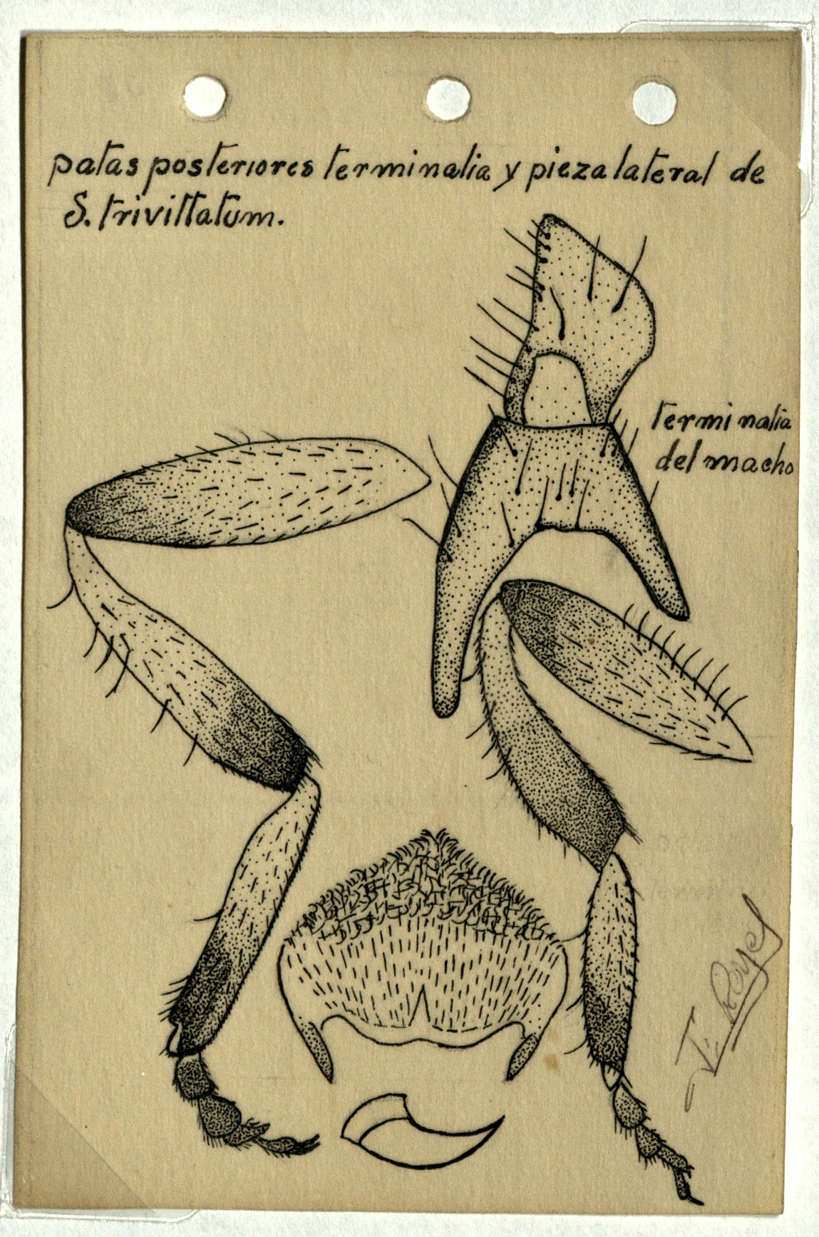 Dibujo de patas posteriores terminalia y pieza lateral de S. Trivittatum. Campaña contra la oncocercosis y mal de pinto en la Sierra Norte del Estado de Oaxaca.