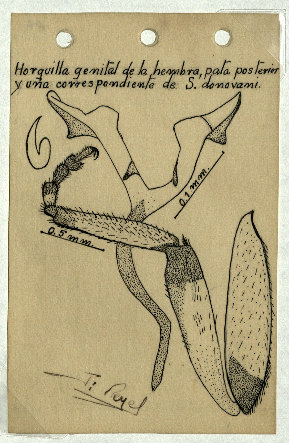 Horquilla genital de la hembra, pata posterior y uña correspondiente de S. donovani.