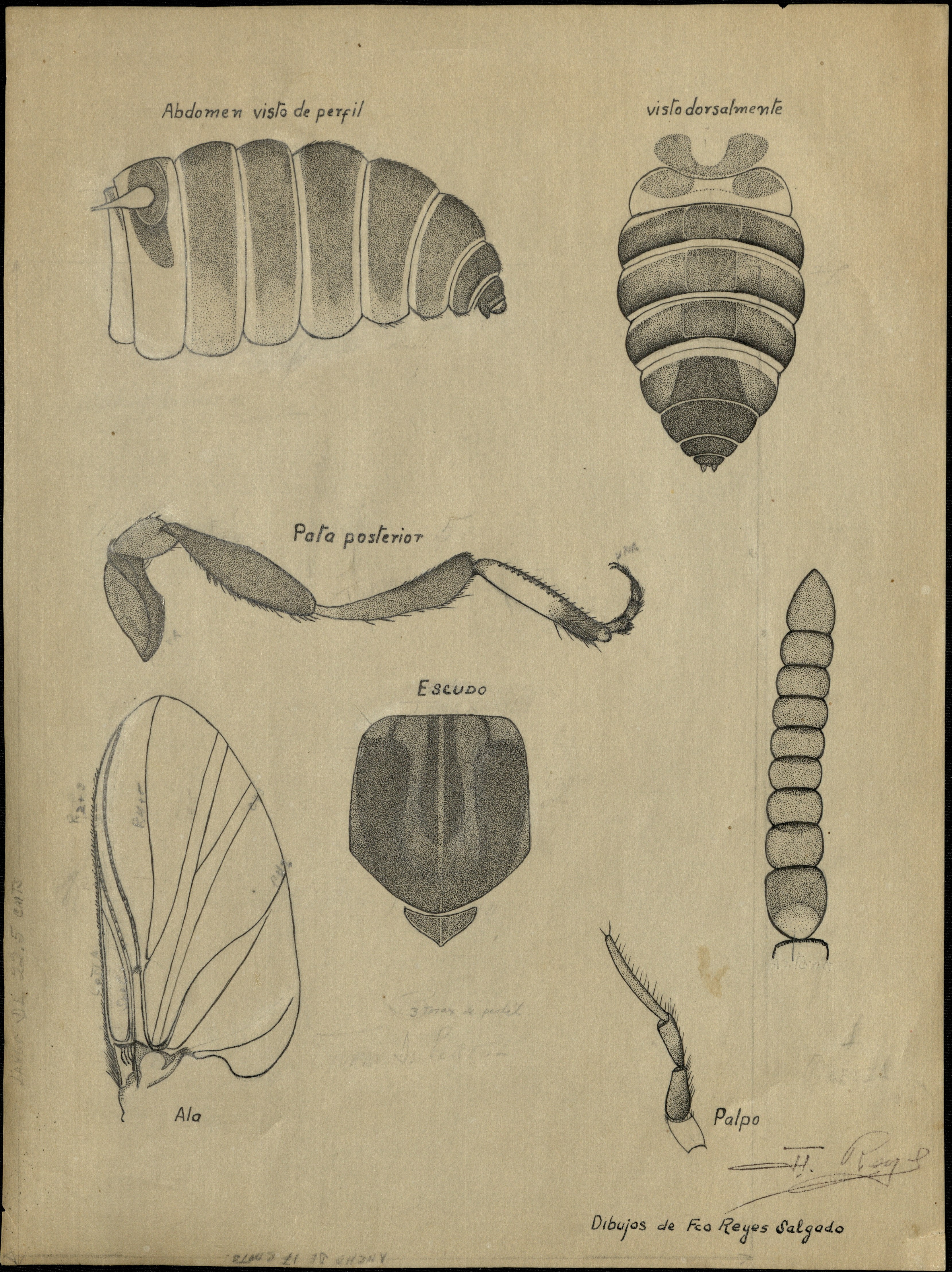 Dibujo de abdomen visto de perfil y visto dorsalmente, pata posterior, ala, escudo, palpo y pieza sin nombre, contiene la firma del autor y dibujos de Fco. Reyes Salgado en el ángulo inferior derecho. Compaña contra la oncocercosis y mal del pinto en la Sierra Norte de Oaxaca.