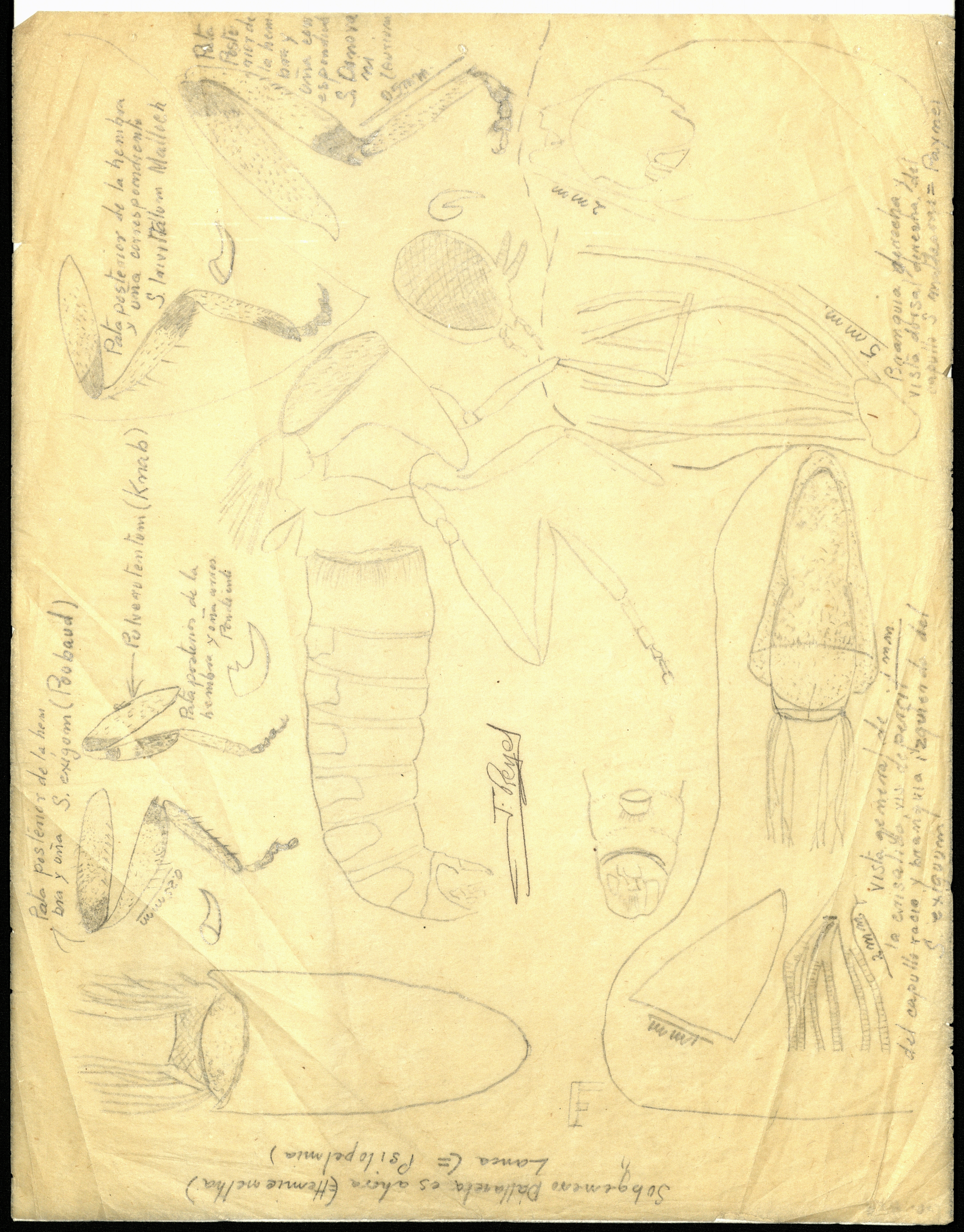 Dibujo de Subgénero Dallareta es ahora (=Hemienetha), subgénero Lanea (=Psilopelmia). Vista general de la crisalida, vista de perfil del capullo vacio y branquia izquierda del S. exiguum. Pata posterior de la hembra y uña S. exigum (Poubaud), Pulverutentum (Knab), pata de la hembra y uña correspondiente. Pata posterior de la hembra y uña correspondiente S. Trivittatum Malloch. Pata posterior de la hembra y uña correspondiente S. Denevani. Branquia derecha, vista dorsal derecha del capullo S. Mathesoni=Raynei, contiene firma del autor.