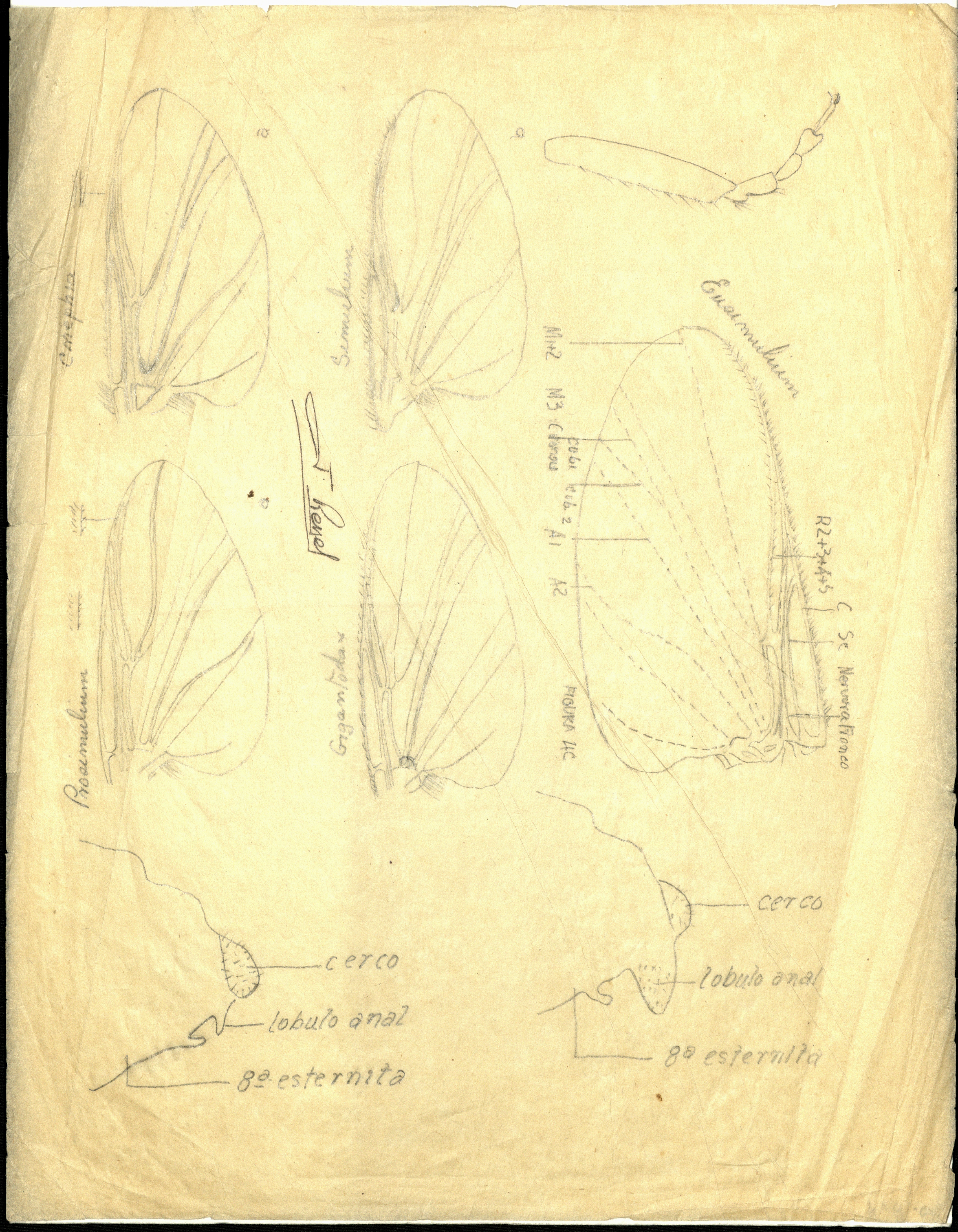 Dibujo de Prosimulium [ala], Cnephia [ala], Gigantorax [ala], Simulium [ala], Eusimulium [ala], cerco, lóbulo anal, octava esternita, contiene firma del autor. Compaña contra la oncocercosis y mal del pinto en la Sierra Norte de Oaxaca.