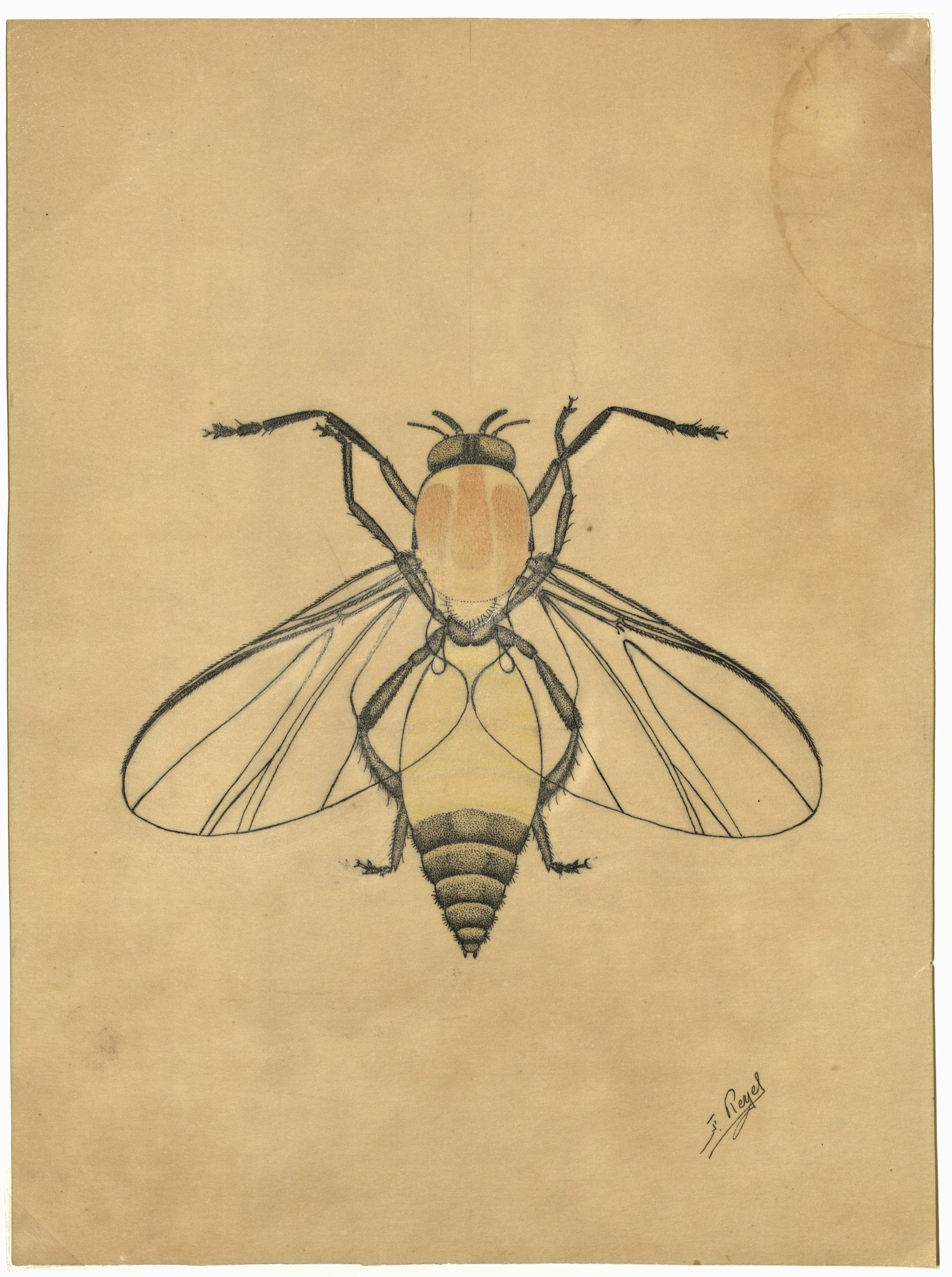 Dibujo de simúlido completo no identificado, el escudo coloreado con color rojo, el abdomen coloreado con color amarillo, contiene la firma del autor. Compaña contra la oncocercosis y mal del pinto en la Sierra Norte de Oaxaca.
