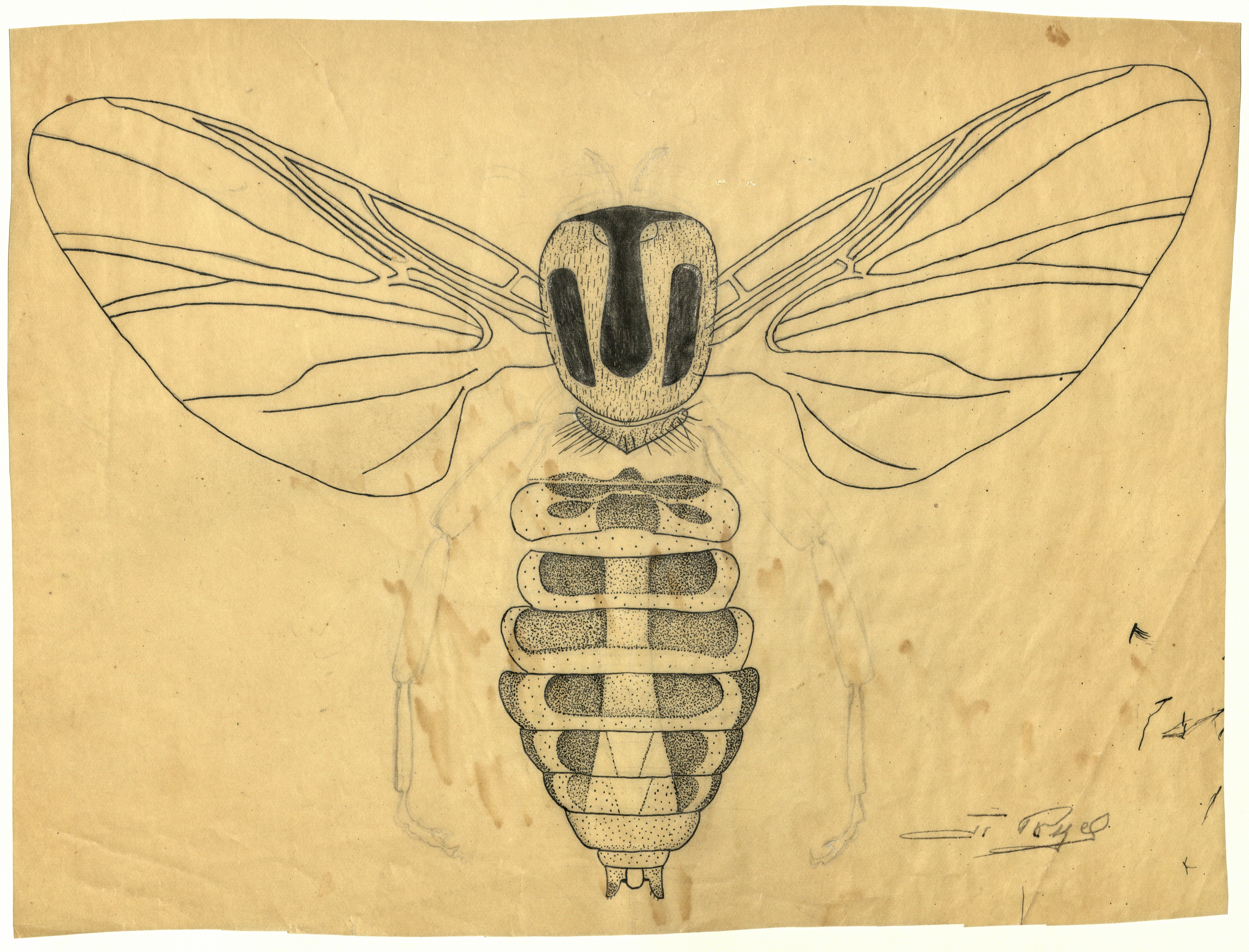 Dibujo completo de simúlido desconocido, no esta terminado, contiene firma del autor. Compaña contra la oncocercosis y mal del pinto en la Sierra Norte de Oaxaca.