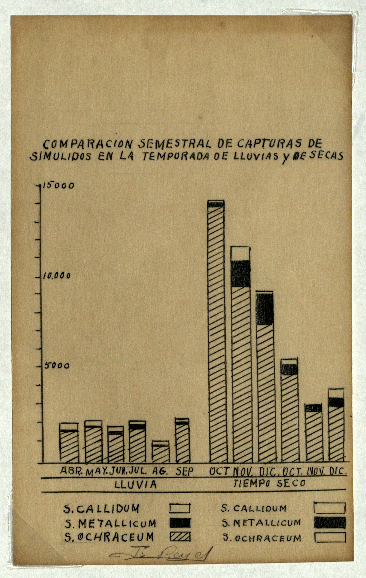 El manuscrito contiene las gráficas de comparación semestral de captura de simúlidos en la temporada de lluvia abril a septiembre y de secas octubre a diciembre, simúlidos callidum, metallicum y ochraceum, contiene firma del autor. Compaña contra la oncocercosis y mal del pinto en la Sierra Norte de Oaxaca.