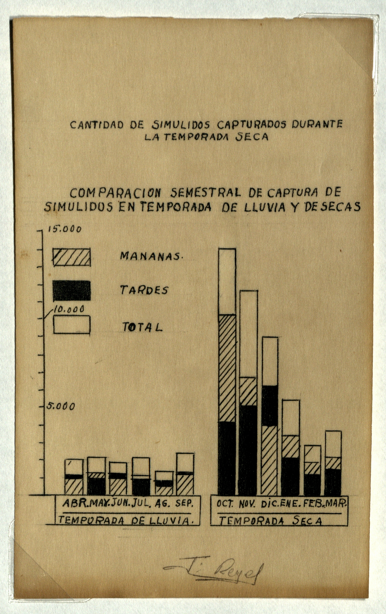 El manuscrito contiene las tablas de la cantidad de simúlidos capturados durante la temporada de seca y comparación semestral de captura de sumúlidos en temporada de lluvia de abril a septiembre y secas de octubre a marzo, contiene la firma del autor. Compaña contra la oncocercosis y mal del pinto en la Sierra Norte de Oaxaca.