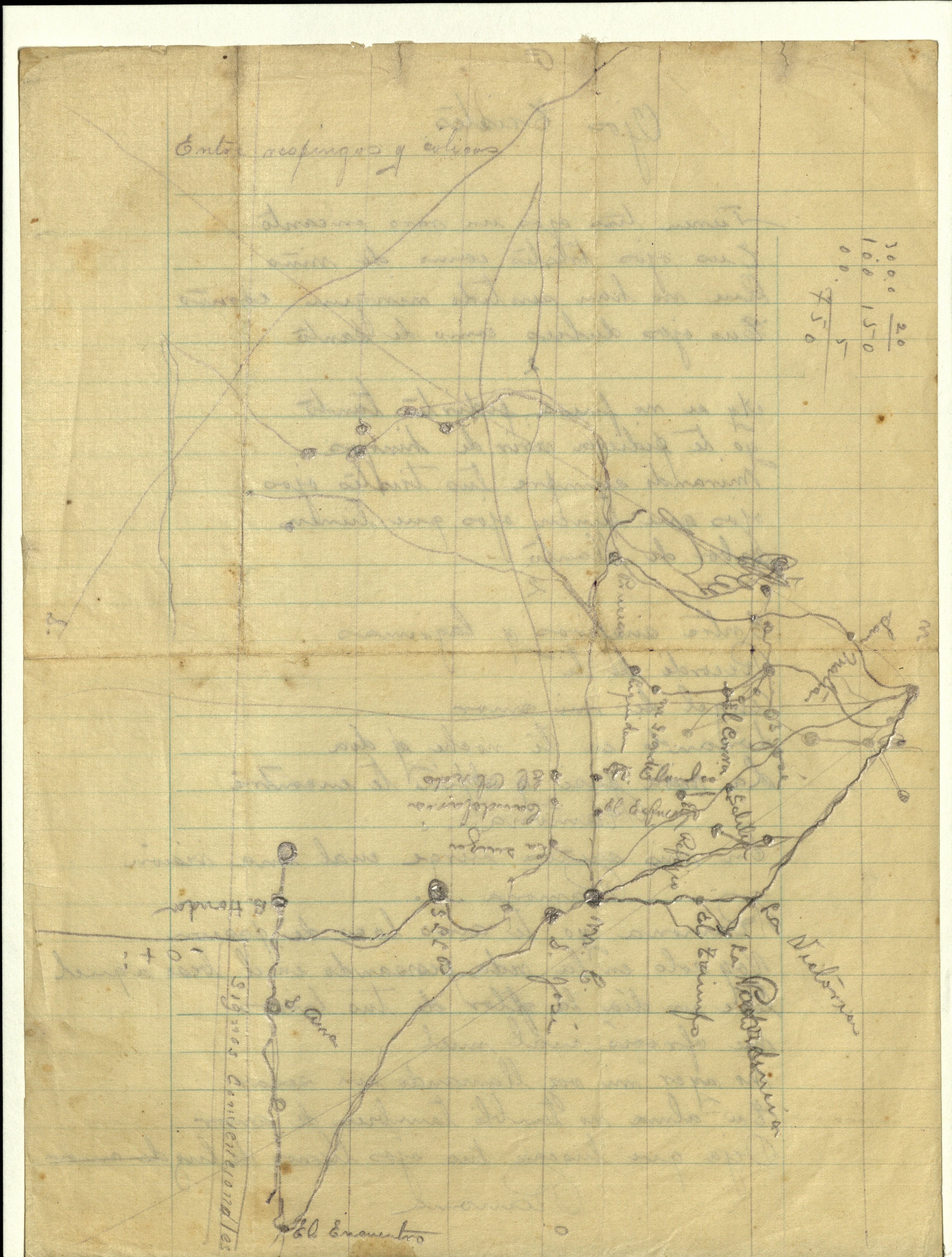 Dibujo de mapa, comunidad no identificada, anotaciones en el ángulo superior e inferior izquierdo, nombres de algunas comunidades: San Matías, El Olivo, Candelaria, Soledad, Refugio, La Victoria, San José. Compaña contra la oncocercosis y mal del pinto en la Sierra Norte de Oaxaca.