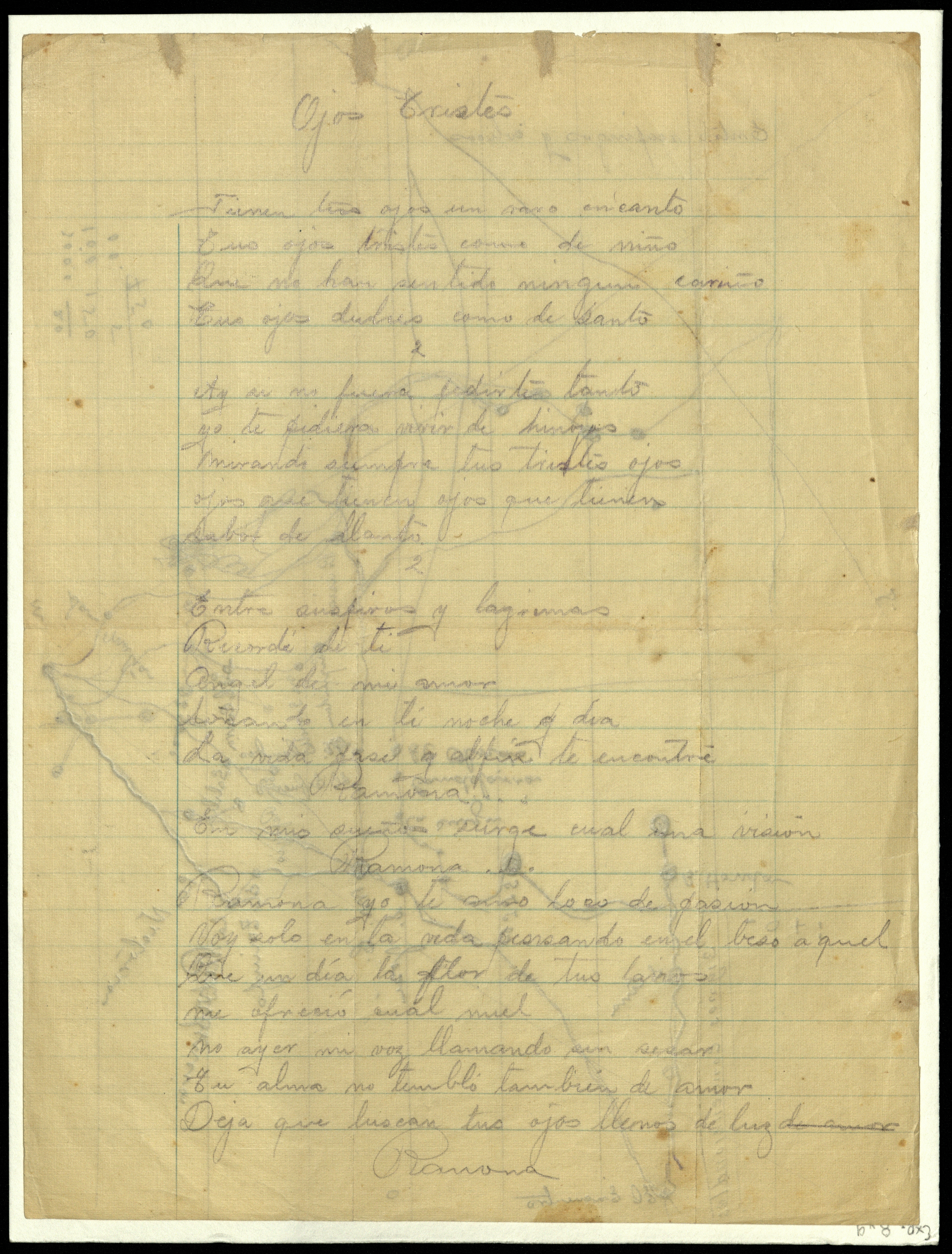 Poema: Ojos Tristes, esta escrito en el verso de mapa de la comunidad sin identificar, dedicado a Ramona. Compaña contra la oncocercosis y mal del pinto en la Sierra Norte de Oaxaca.