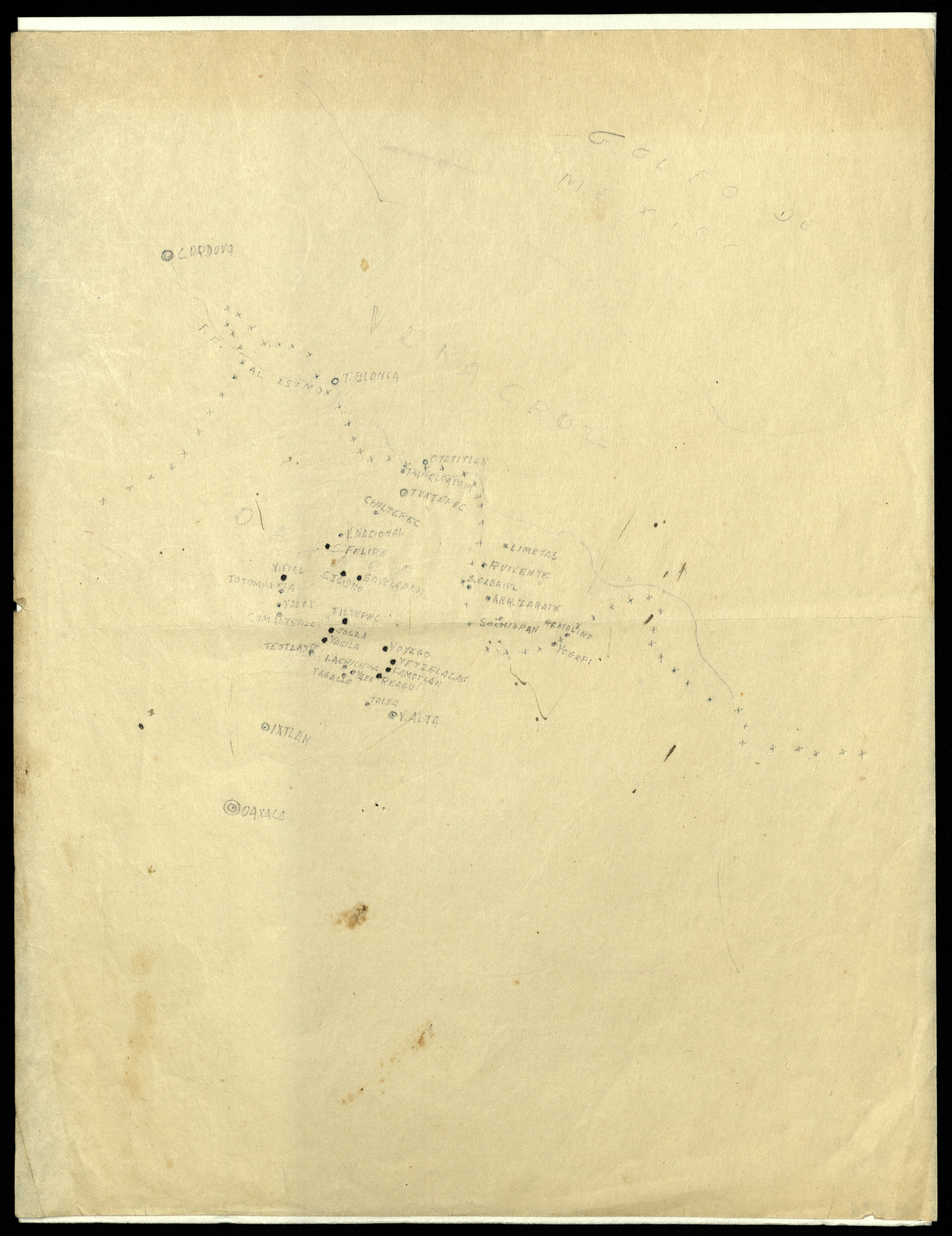 Dibujo del mapa de la Sierra Norte y la Cuenca del Papaluapam del Estado de Oaxaca, comunidades cercanas: Tuxtepec, Chiltepec, Limetas, Puerto Vicente, San Gabriel, Valle Nacional, San Felipe, Soyolapam, San Isidro, Sochiapan, Remolino, Yogapi, Totomaxtla, Yolox, Tiltepec, Comaltepec, Josaa, Yagila, Yovego, Yetzelalag, Comatlán, Talea, Villa Alta, Ixtlán y los limites con el Estado de Veracurz. Compaña contra la oncocercosis y mal del pinto en la Sierra Norte de Oaxaca.