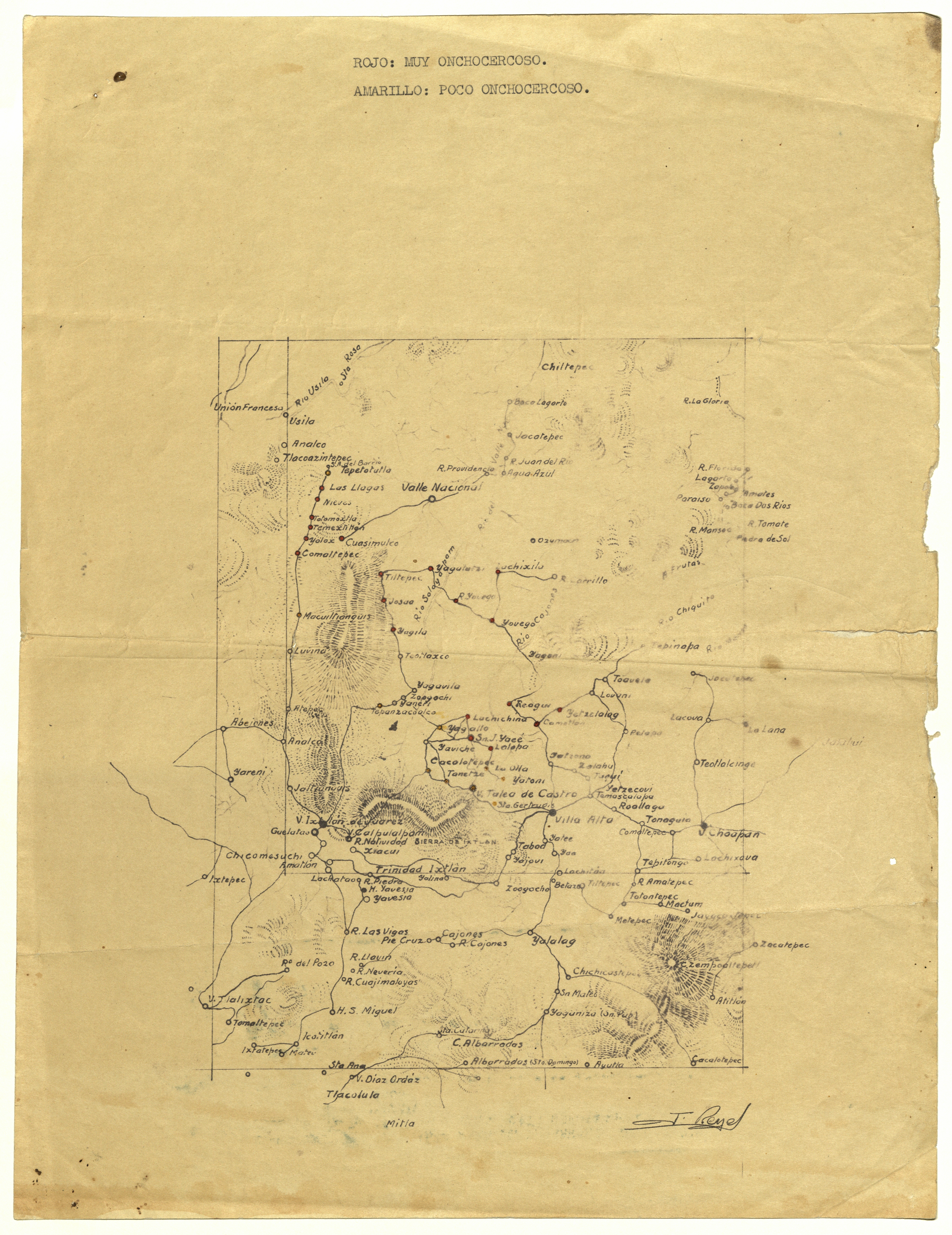 Dibujo de mapa de las comunidades afectadas por la oncocercosis en el rincón de la sierra, en rojo los pueblos muy oncocercosos y en amarillo poco oncocercoso. Compaña contra la oncocercosis y mal del pinto en la Sierra Norte de Oaxaca.