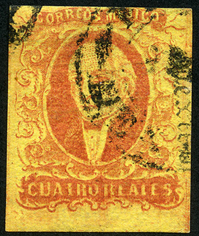Para más información favor de dirigirse a biblioteca@mufi.org.mx No. Scott: 38 -- Año de Emisión: 1867 -- Valor facial: Cuatro Reales -- Variedad de color: Rojo sobre Amarillo -- Dentado: Sin dentado -- Tipo de impresión: Grabado Timbre Postal Mexicano en color Rojo sobre Amarillo, en la parte superior se observa la leyenda "CORREOS MEJICO", en la parte inferior el valor facial de Cuatro Reales, del lado izquierdo y derecho hay un grabado ornamentado en forma de óvalo y en el centro se observa la imagen de Miguel Hidalgo y Costilla.