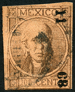 Para más información favor de dirigirse a biblioteca@mufi.org.mx No. Scott: 51 -- Año de Emisión: 1868 -- Valor facial: 100 Centavos -- Variedad de color: Café sobre Café Rojizo -- Dentado: Sin dentado -- Tipo de impresión: Grabado Timbre Postal Mexicano en color Café sobre Café Rojizo, en él se observa la imagen de Miguel Hidalgo y Costilla, la cual se centra en un círculo, en la parte superior del timbre está escrita la palabra "MËXICO" y en la parte inferior el valor facial de "100 CENT".