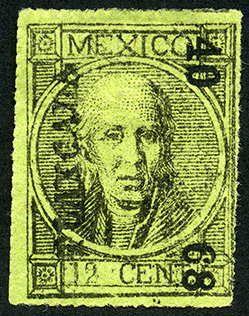 Para más información favor de dirigirse a biblioteca@mufi.org.mx No. Scott: 53 -- Año de Emisión: 1868 -- Valor facial: 12 Centavos -- Variedad de color: Negro sobre Verde -- Tipo de impresión: Grabado Timbre Postal Mexicano en color Negro sobre Verde, en él se observa la imagen de Miguel Hidalgo y Costilla, la cual se centra en un círculo, en la parte superior del timbre está escrita la palabra "MËXICO" y en la parte inferior el valor facial de "12 CENT".