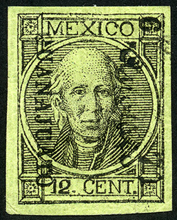 Para más información favor de dirigirse a biblioteca@mufi.org.mx No. Scott: 72 -- Año de Emisión: 1872 -- Valor facial: 12 Centavos -- Variedad de color: Negro sobre Verde -- Dentado: Sin dentado -- Tipo de impresión: Grabado Timbre Postal Mexicano en color Negro sobre Verde, en él se observa la imagen de Miguel Hidalgo y Costilla, la cual se centra en un círculo, en la parte superior del timbre está escrita la palabra "MËXICO" y en la parte inferior el valor facial de "12 CENT", sobre la imagen también existe una sobremarca en color negro.