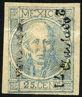 Para más información favor de dirigirse a biblioteca@mufi.org.mx No. Scott: 73 -- Año de Emisión: 1872 -- Valor facial: 25 Centavos -- Variedad de color: Azul sobre Blanco Rosáceo -- Dentado: Sin dentado -- Tipo de impresión: Grabado Timbre Postal Mexicano en color Azul sobre Blanco Rosáceo, en él se observa la imagen de Miguel Hidalgo y Costilla, la cual se centra en un círculo, en la parte superior del timbre está escrita la palabra "MËXICO" y en la parte inferior el valor facial de "25 CENT", sobre la imagen también existe una sobremarca en color negro.