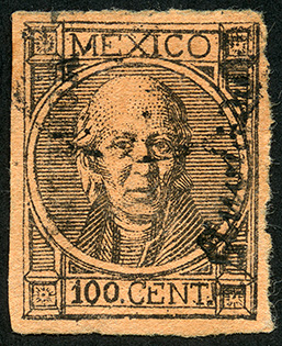 Para más información favor de dirigirse a biblioteca@mufi.org.mx No. Scott: 75 -- Año de Emisión: 1872 -- Valor facial: 100 Centavos -- Variedad de color: Negro sobre Café Rojizo -- Dentado: Sin dentado -- Tipo de impresión: Grabado Timbre Postal Mexicano en color Negro sobre Ante, en él se observa la imagen de Miguel Hidalgo y Costilla, la cual se centra en un círculo, en la parte superior del timbre está escrita la palabra "MËXICO" y en la parte inferior el valor facial de "6 CENT", sobre la imagen también existe una sobremarca en color negro.