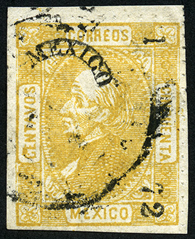 Para más información favor de dirigirse a biblioteca@mufi.org.mx No. Scott: 102 -- Año de Emisión: 1872 -- Valor facial: 50 Centavos -- Variedad de color: Amarillo -- Tipo de impresión: Grabado Timbre Postal Mexicano en color Amarillo, en él se observa la imagen de Miguel Hidalgo y Costilla, la cual se centra en un óvalo ornamentado, en la parte superior está escrita la palabra "CORREOS", en la parte inferior "MEXICO", del lado izquierdo la palabra "CENTAVOS", lado derecho el valor facial de "CINCUENTA", sobre la imagen también existe una sobremarca en color negro.