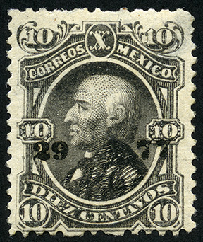 Para más información favor de dirigirse a biblioteca@mufi.org.mx No. Scott: 107 -- Año de Emisión: 1878 -- Valor facial: 10 Centavos -- Variedad de color: Negro -- Dentado: 12 -- Tipo de impresión: Grabado Timbre Postal Mexicano en color negro, en él se observa la imagen de Miguel Hidalgo y Costilla, la cual se centra en un círculo ornamentado, en la parte superior está escrita la palabra "CORREOS MEXICO", en la parte inferior "DIEZ CENTAVOS", sobre la imagen aparece una sobremarca en color negro.