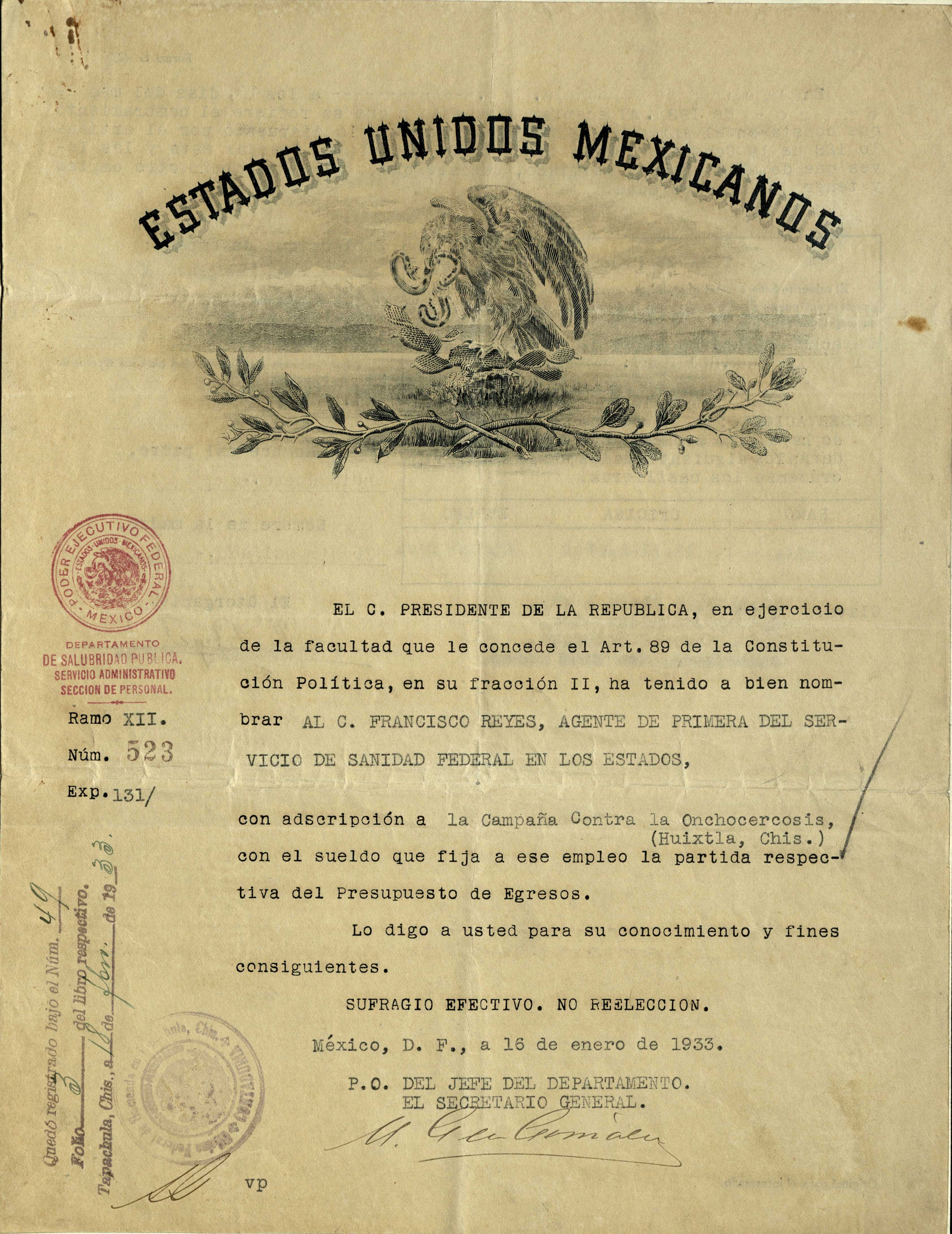 Nombramiento de Francisco Reyes, como agente de primera del servicio de sanidad federal en los estados, con adscripción a la Campaña contra la onchocercosis en Huixtla, Chiapas el 16 de enero de 1933. Campaña contra la oncocercosis y mal de pinto en la Sierra Norte del Estado de Oaxaca.