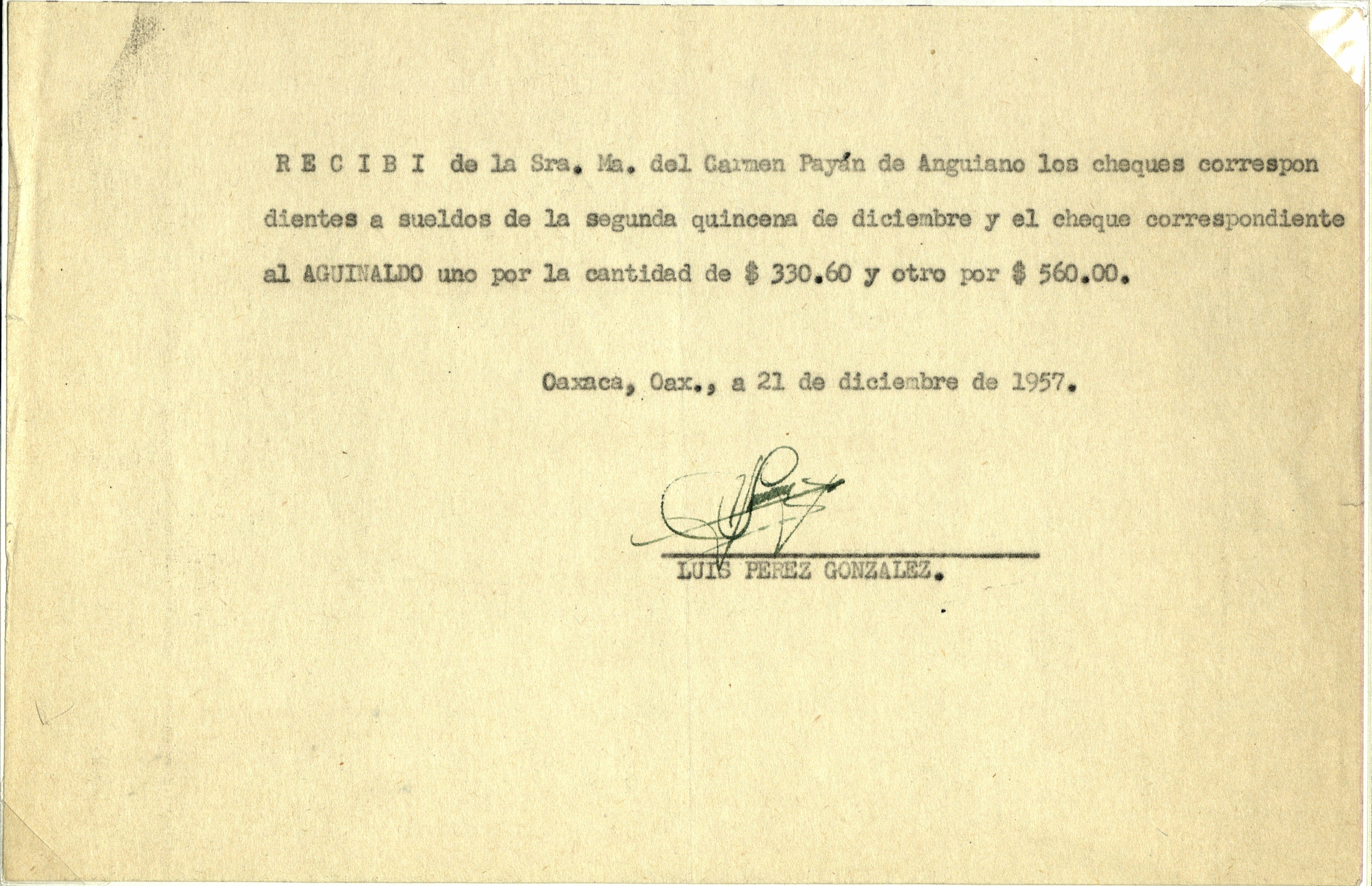 Luis Pérez González, recibió de la señora María del Carmen Payán de Anguiano los cheques correspondientes a sueldos de la siguiente quincena de diciembre. Campaña contra la oncocercosis y mal de pinto en la Sierra Norte del Estado de Oaxaca.