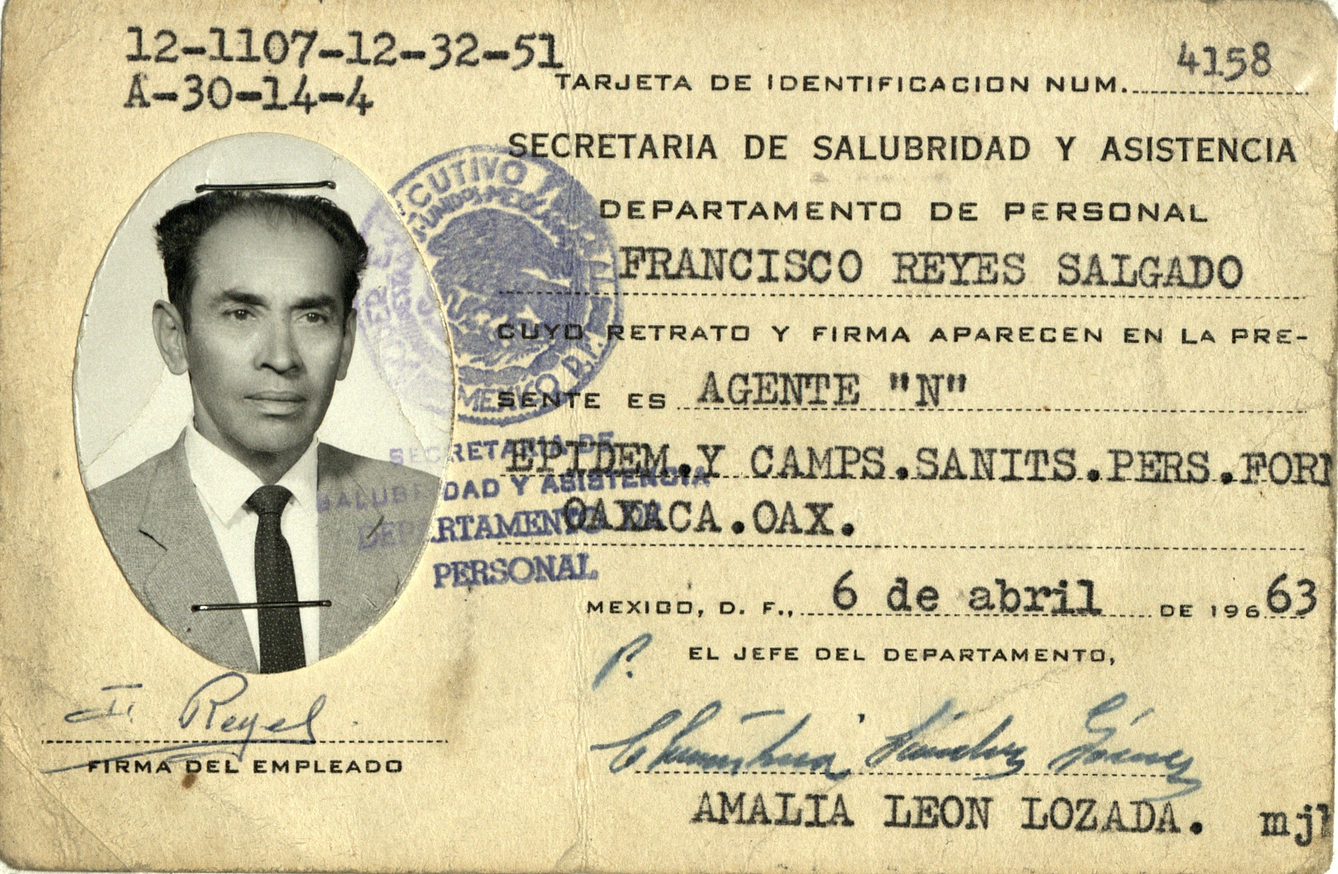 Tarjeta de identificación número 4158 de Francisco Reyes Salgado como agente "N" en epidemiología y campañas sanitaris, personal formal. Oaxaca, Oaxaca.