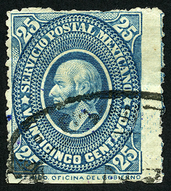 Para más información favor de dirigirse a biblioteca@mufi.org.mx No. Scott: 173-- Año de Emisión: 1885 -- Valor facial: Veinticinco Centavos -- Variedad de color: Azul Verdoso -- Dentado: 12 -- Tipo de impresión: Grabado Timbre Postal Mexicano en color azul verdoso, en él se observa la imagen de Miguel Hidalgo y Costilla, la cual se centra en un óvalo ornamentado, alrededor del mismo está escrito "SERVICIO POSTAL MEXICANO" y "VEINTICINCO CENTAVOS", así también aparece en cada esquina el valor facial con número.