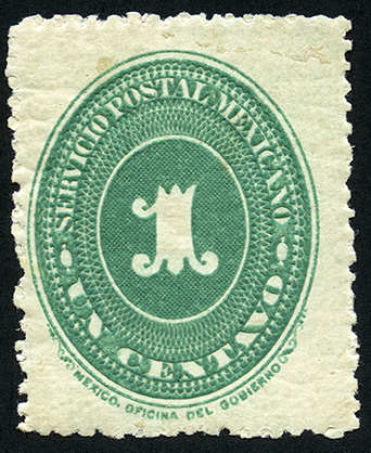 Para más información favor de dirigirse a biblioteca@mufi.org.mx No. Scott: 174 -- Año de Emisión: 1886 -- Valor facial: Un Centavo -- Variedad de color: Verde Amarillento -- Dentado: 12 -- Tipo de impresión: Grabado Timbre Postal Mexicano en color verde amarillento , en él se observa el número uno, el cual se encuentra centrado en un óvalo ornamentado, alrededor del mismo está escrito "SERVICIO POSTAL MEXICANO" y el valor facial de "UN CENTAVO"..
