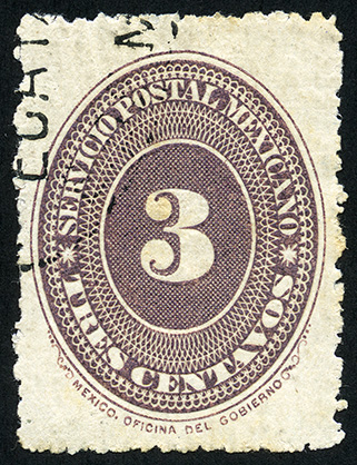 Para más información favor de dirigirse a biblioteca@mufi.org.mx No. Scott: 176 -- Año de Emisión: 1886 -- Valor facial: Tres Centavos -- Variedad de color: Lila -- Dentado: 12 -- Tipo de impresión: Grabado Timbre Postal Mexicano en color lila , en él se observa el número tres, el cual se encuentra centrado en un óvalo ornamentado, alrededor del mismo está escrito "SERVICIO POSTAL MEXICANO" y el valor facial de "TRES CENTAVOS"..