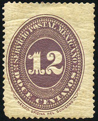 Para más información favor de dirigirse a biblioteca@mufi.org.mx No. Scott: 181 -- Año de Emisión: 1886 -- Valor facial: Doce Centavos -- Variedad de color: Lila -- Dentado: 12 -- Tipo de impresión: Grabado Timbre Postal Mexicano en color lila , en él se observa el número doce, el cual se encuentra centrado en un óvalo ornamentado, alrededor del mismo está escrito "SERVICIO POSTAL MEXICANO" y el valor facial de "DOCE CENTAVOS"..