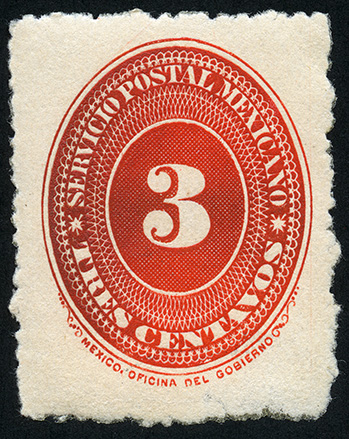 Para más información favor de dirigirse a biblioteca@mufi.org.mx No. Scott: 184 -- Año de Emisión: 1887 -- Valor facial: Tres Centavos -- Variedad de color: Escarlata -- Dentado: 12 -- Tipo de impresión: Grabado Timbre Postal Mexicano en color escarlata , en él se observa el número tres, el cual se encuentra centrado en un óvalo ornamentado, alrededor del mismo está escrito "SERVICIO POSTAL MEXICANO" y el valor facial de "TRES CENTAVOS"..