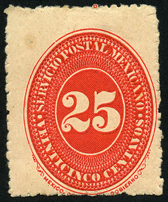 Para más información favor de dirigirse a biblioteca@mufi.org.mx No. Scott: 189 -- Año de Emisión: 1887 -- Valor facial: Veinticinco Centavos -- Variedad de color: Escarlata -- Dentado: 12 -- Tipo de impresión: Grabado Timbre Postal Mexicano en color escarlata , en él se observa el número veinticinco, el cual se encuentra centrado en un óvalo ornamentado, alrededor del mismo está escrito "SERVICIO POSTAL MEXICANO" y el valor facial de "VEINTICINCO CENTAVOS"..