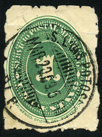 Para más información favor de dirigirse a biblioteca@mufi.org.mx No. Scott: 190 -- Año de Emisión: 1887 -- Valor facial: Un Centavo -- Variedad de color: Verde Azul -- Dentado: 6 -- Tipo de impresión: Grabado Timbre Postal Mexicano en color verde azul , en él se observa el número uno, el cual se encuentra centrado en un óvalo ornamentado, alrededor del mismo está escrito "SERVICIO POSTAL MEXICANO" y el valor facial de "UN CENTAVO". sobre la misma imagen aparece un sello de cancelación en color negro.