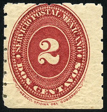 Para más información favor de dirigirse a biblioteca@mufi.org.mx No. Scott: 191 -- Año de Emisión: 1887 -- Valor facial: Dos Centavos -- Variedad de color: Café Carmín -- Dentado: 6 -- Tipo de impresión: Grabado Timbre Postal Mexicano en color café carmín , en él se observa el número dos, el cual se encuentra centrado en un óvalo ornamentado, alrededor del mismo está escrito "SERVICIO POSTAL MEXICANO" y el valor facial de "DOS CENTAVOS".