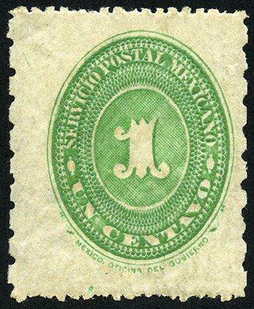 Para más información favor de dirigirse a biblioteca@mufi.org.mx No. Scott: 194A -- Año de Emisión: 1887 -- Valor facial: Un Centavo -- Variedad de color: Verde Azul -- Dentado: 6x12 -- Tipo de impresión: Grabado Timbre Postal Mexicano en color verde azul, en él se observa el número uno, el cual se encuentra centrado en un óvalo ornamentado, alrededor del mismo está escrito "SERVICIO POSTAL MEXICANO" y el valor facial de "UN CENTAVO".