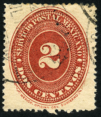 Para más información favor de dirigirse a biblioteca@mufi.org.mx No. Scott: 194B -- Año de Emisión: 1887 -- Valor facial: Dos Centavos -- Variedad de color: Carmín -- Dentado: 6x12 -- Tipo de impresión: Grabado Timbre Postal Mexicano en color carmín, en él se observa el número dos, el cual se encuentra centrado en un óvalo ornamentado, alrededor del mismo está escrito "SERVICIO POSTAL MEXICANO" y el valor facial de "DOS CENTAVOS".
