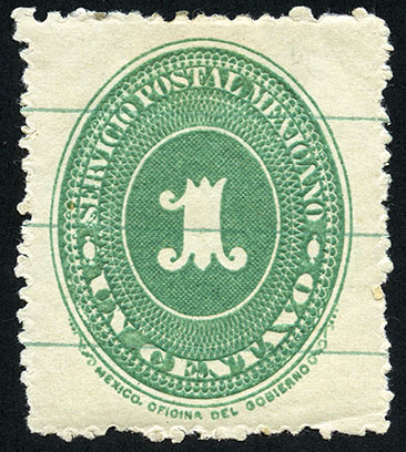 Para más información favor de dirigirse a biblioteca@mufi.org.mx No. Scott: 195 -- Año de Emisión: 1887 -- Valor facial: Un Centavo -- Variedad de color: Verde -- Dentado: 12 -- Tipo de impresión: Grabado Timbre Postal Mexicano en color verde, en él se observa el número uno, el cual se encuentra centrado en un óvalo ornamentado, alrededor del mismo está escrito "SERVICIO POSTAL MEXICANO" y el valor facial de "UN CENTAVO".