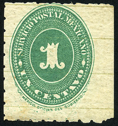 Para más información favor de dirigirse a biblioteca@mufi.org.mx No. Scott: 201 -- Año de Emisión: 1887 -- Valor facial: Un Centavo -- Variedad de color: Verde -- Dentado: 6 -- Tipo de impresión: Grabado Timbre Postal Mexicano en color verde, en él se observa el número uno, el cual se encuentra centrado en un óvalo ornamentado, alrededor del mismo está escrito "SERVICIO POSTAL MEXICANO" y el valor facial de "UN CENTAVO".