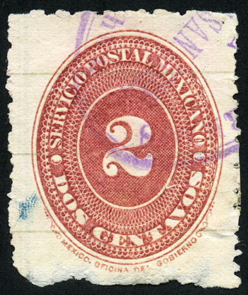 Para más información favor de dirigirse a biblioteca@mufi.org.mx No. Scott: 208 -- Año de Emisión: 1887 -- Valor facial: Dos Centavos -- Variedad de color: Carmín -- Dentado: 6x12 -- Tipo de impresión: Grabado Timbre Postal Mexicano en color carmín, en él se observa el número dos, el cual se encuentra centrado en un óvalo ornamentado, alrededor del mismo está escrito "SERVICIO POSTAL MEXICANO" y el valor facial de "DOS CENTAVOS".