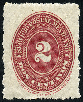 Para más información favor de dirigirse a biblioteca@mufi.org.mx No. Scott: 213 -- Año de Emisión: 1890-1895 -- Valor facial: Dos Centavos -- Variedad de color: Carmín -- Dentado: 11 y 12 -- Tipo de impresión: Grabado Timbre Postal Mexicano en color carmín, en él se observa el número dos, el cual se encuentra centrado en un óvalo ornamentado, alrededor del mismo está escrito "SERVICIO POSTAL MEXICANO" y el valor facial de "DOS CENTAVOS".