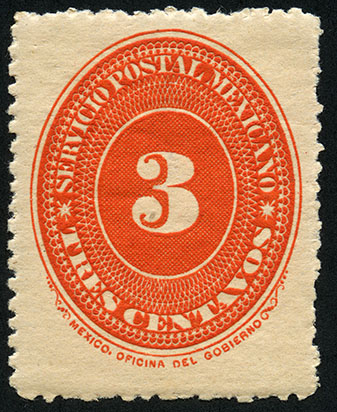 Para más información favor de dirigirse a biblioteca@mufi.org.mx No. Scott: 214 -- Año de Emisión: 1890-1895 -- Valor facial: Tres Centavos -- Variedad de color: Bermellón -- Dentado: 11 y 12 -- Tipo de impresión: Grabado Timbre Postal Mexicano en color bermellón, en él se observa el número tres, el cual se encuentra centrado en un óvalo ornamentado, alrededor del mismo está escrito "SERVICIO POSTAL MEXICANO" y el valor facial de "TRES CENTAVOS".