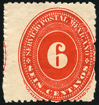 Para más información favor de dirigirse a biblioteca@mufi.org.mx No. Scott: 217 -- Año de Emisión: 1890-1895 -- Valor facial: Seis Centavos -- Variedad de color: Bermellón -- Dentado: 11 y 12 -- Tipo de impresión: Grabado Timbre Postal Mexicano en color bermellón, en él se observa el número seis, el cual se encuentra centrado en un óvalo ornamentado, alrededor del mismo está escrito "SERVICIO POSTAL MEXICANO" y el valor facial de "SEIS CENTAVOS".