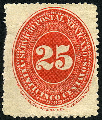 Para más información favor de dirigirse a biblioteca@mufi.org.mx No. Scott: 221 -- Año de Emisión: 1890-1895 -- Valor facial: Veinticinco Centavos -- Variedad de color: Bermellón -- Dentado: 11 y 12 -- Tipo de impresión: Grabado Timbre Postal Mexicano en color bermellón, en él se observa el número veinticinco, el cual se encuentra centrado en un óvalo ornamentado, alrededor del mismo está escrito "SERVICIO POSTAL MEXICANO" y el valor facial de "VEINTICINCO CENTAVOS".